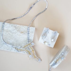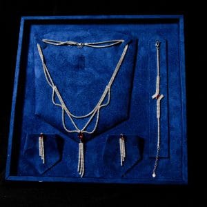 This set is the embodiment of elegance, sophistication, and beauty; it combines simplicity with a luxurious and sparkling character. The set, which includes a pair of earrings, a bracelet, and a necklace, has a distinct shape and is filled with small white stones that reflect elegance on your look. It is suitable for making a wonderful gift and weighs approximately 95 grams.