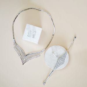 This set is the embodiment of elegance, sophistication, and beauty; it combines simplicity with a luxurious and sparkling character. The set, which includes a pair of earrings, a bracelet, and a necklace, has a distinct shape and is filled with small white stones that reflect elegance on your look. It is suitable for making a wonderful gift and weighs approximately 95 grams.